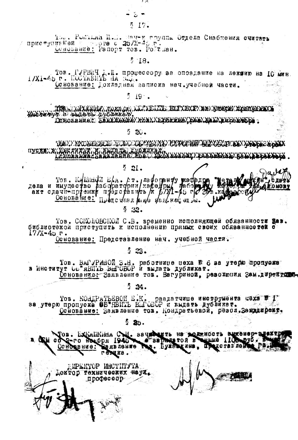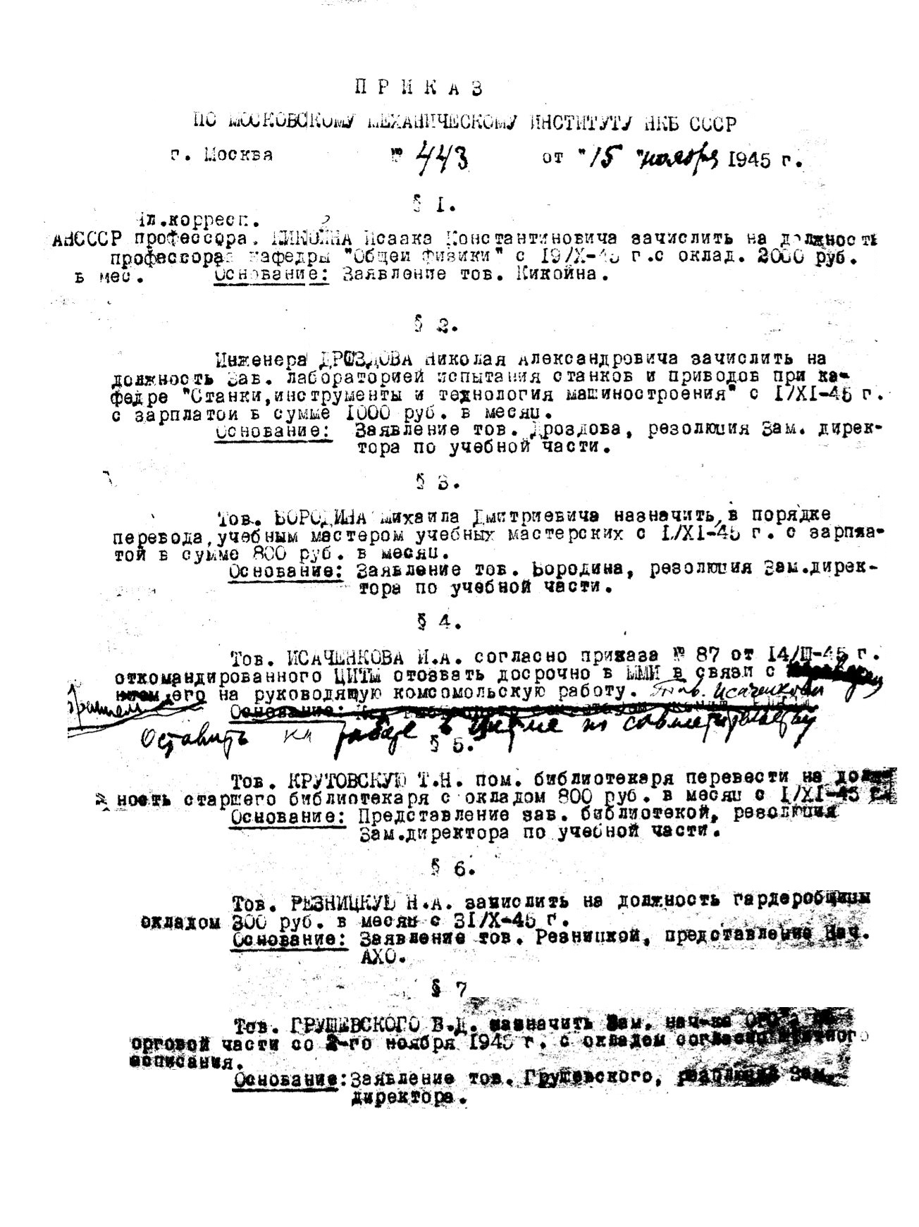 1945_Приказ по Московскому механическому институту НКБ СССР №443
