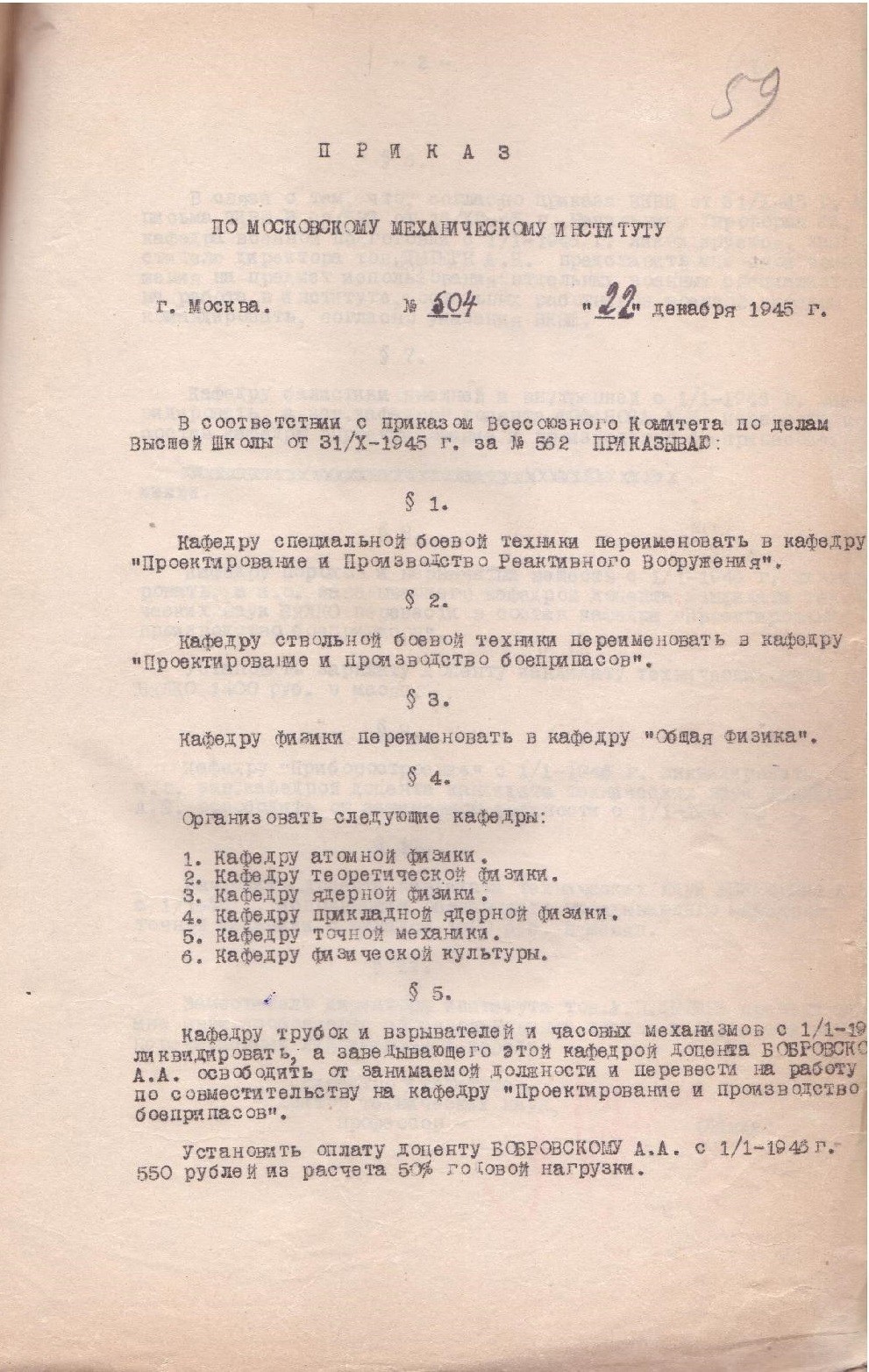 1945_Приказ по Московскому механическому институту №504