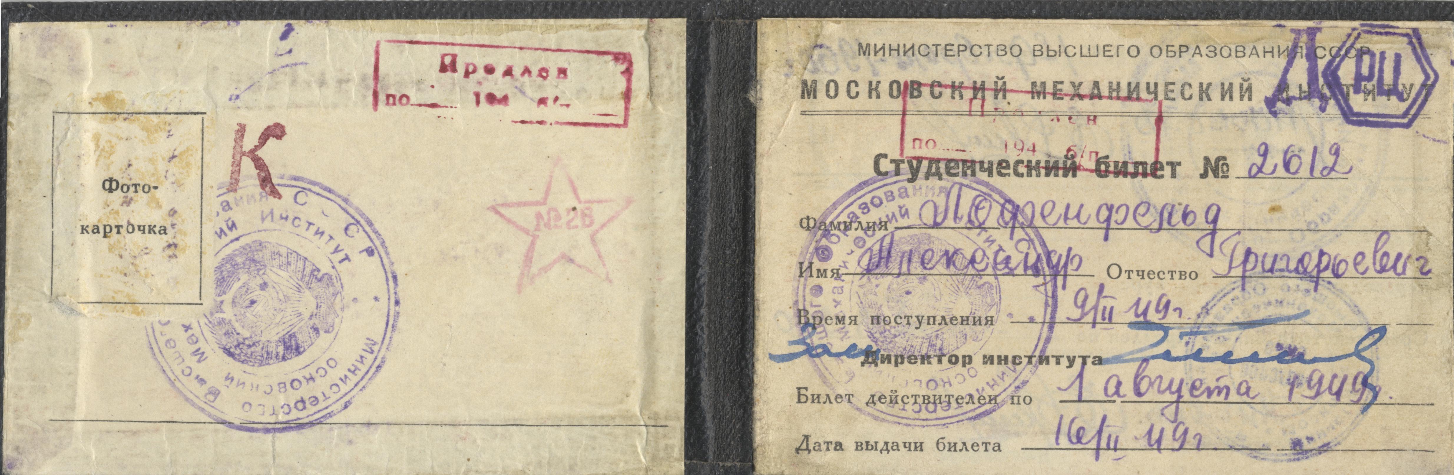 Студенческий билет ММИ (будущий МИФИ) 1949 г., студент Лофенгельд Александр Григорьевич.
